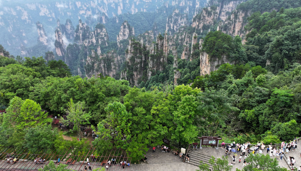 7月14日,游客在張家界國(guó)家森林公園天子山游覽(無(wú)人機(jī)照片)。新華社發(fā)(吳勇兵攝)