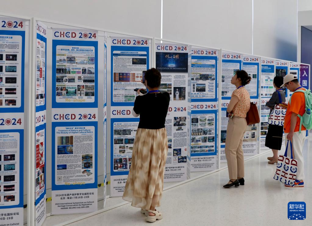 7月16日,參觀者觀看論壇入圍海報展示墻,了解數(shù)字遺產(chǎn)實(shí)踐案例。新華社記者 方思賢 攝