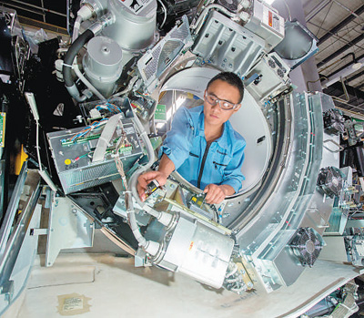 北京經(jīng)濟(jì)技術(shù)開發(fā)區(qū)永昌北路1號(hào),通用電氣醫(yī)療北京影像設(shè)備制造基地(以下簡(jiǎn)稱“北京生產(chǎn)基地”),生產(chǎn)線上機(jī)器轟鳴,一臺(tái)臺(tái)醫(yī)療器械陸續(xù)完成裝配。通用電氣醫(yī)療在全球銷售的每三臺(tái)CT機(jī)中就有2臺(tái)產(chǎn)自這里,產(chǎn)品銷往全球100多個(gè)國(guó)家和地區(qū)。