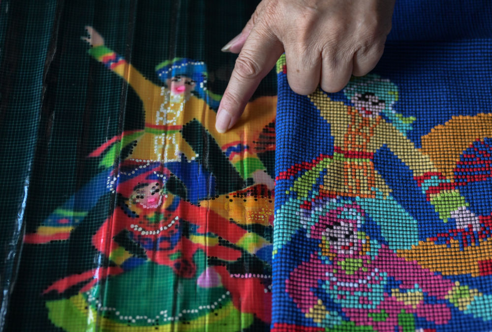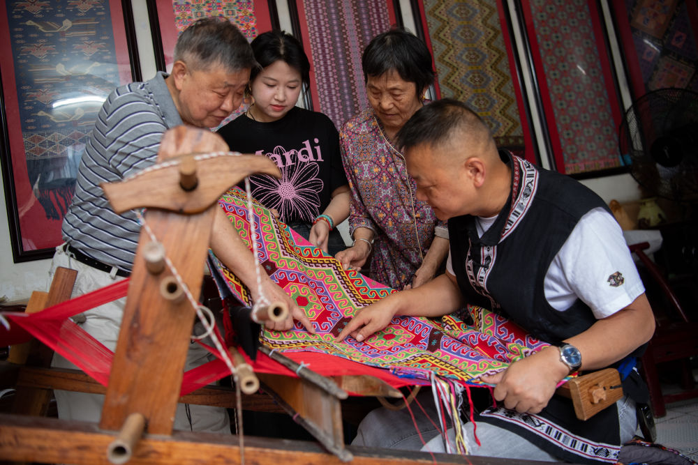 7月2日,唐洪祥的孫女唐鳴珂(后右一)在來鳳縣西蘭卡普培訓(xùn)班上展示西蘭卡普成品。今年29歲的唐鳴珂國(guó)外留學(xué)后回到家鄉(xiāng),從事西蘭卡普的傳承發(fā)展工作。