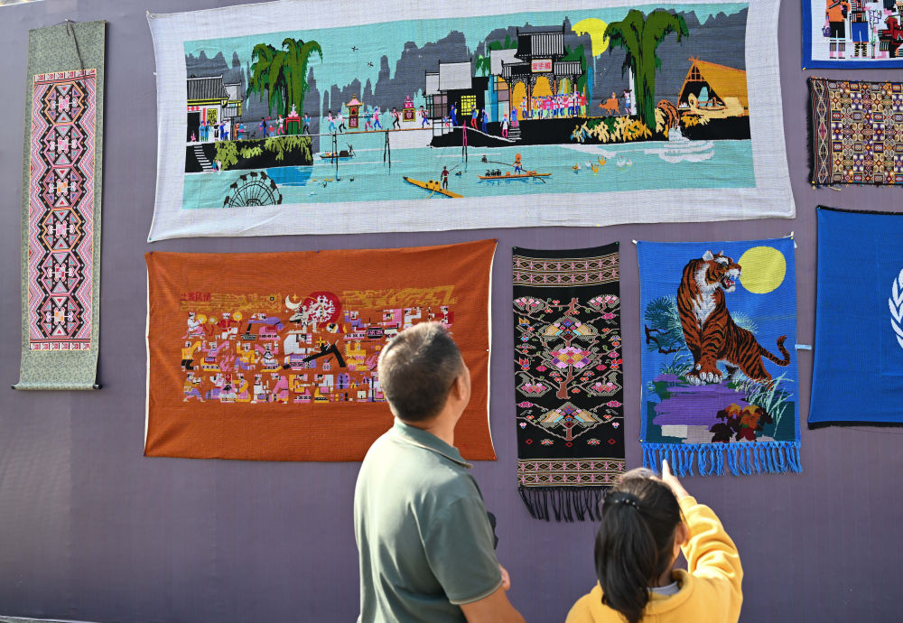 織錦女工在來鳳縣龍鳳文化中心廣場(chǎng)現(xiàn)場(chǎng)制作西蘭卡普,展示非遺技藝(2023年10月28日攝,無人機(jī)照片)。