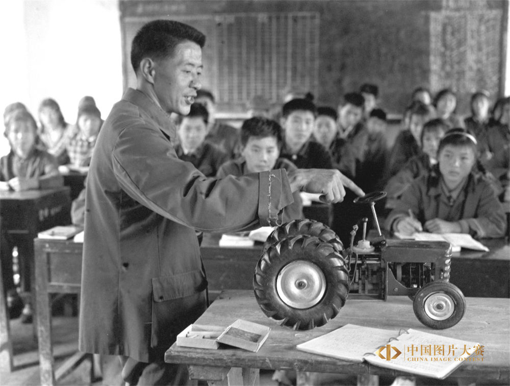 1980年12月4日,湖北省蒲圻縣泉口農(nóng)業(yè)中學(xué)教師給農(nóng)機(jī)班學(xué)生講拖拉機(jī)結(jié)構(gòu)原理。李一方 攝/新華社中國照片檔案館
