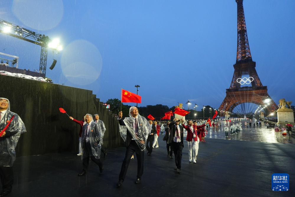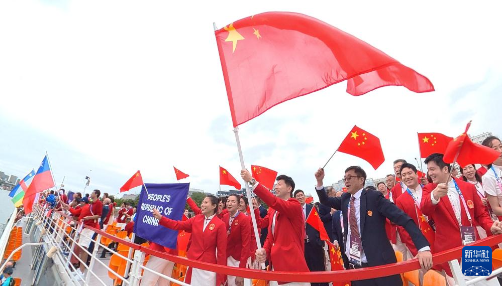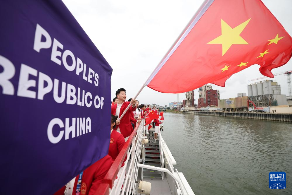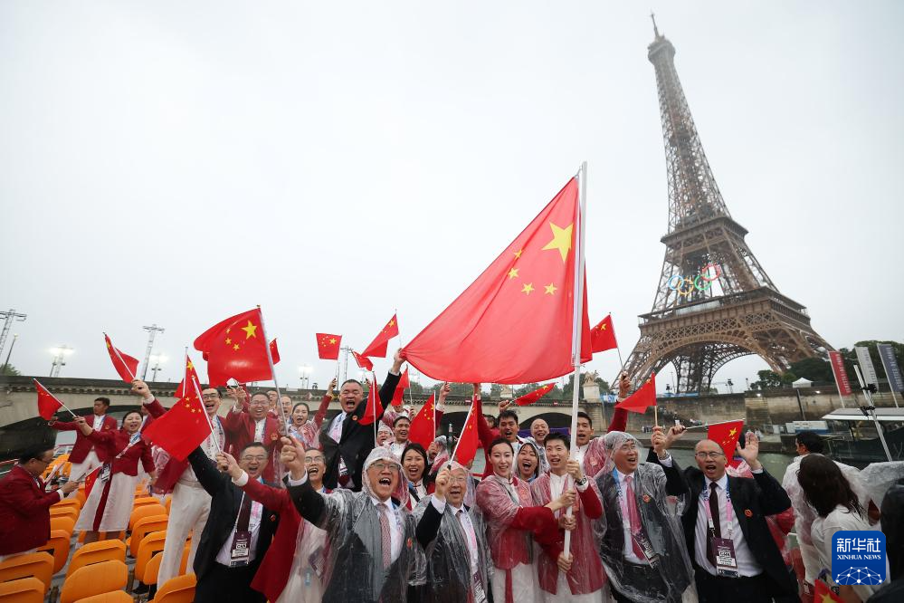 7月26日,中國體育代表團成員在開幕式現(xiàn)場。新華社記者 王毓國 攝
