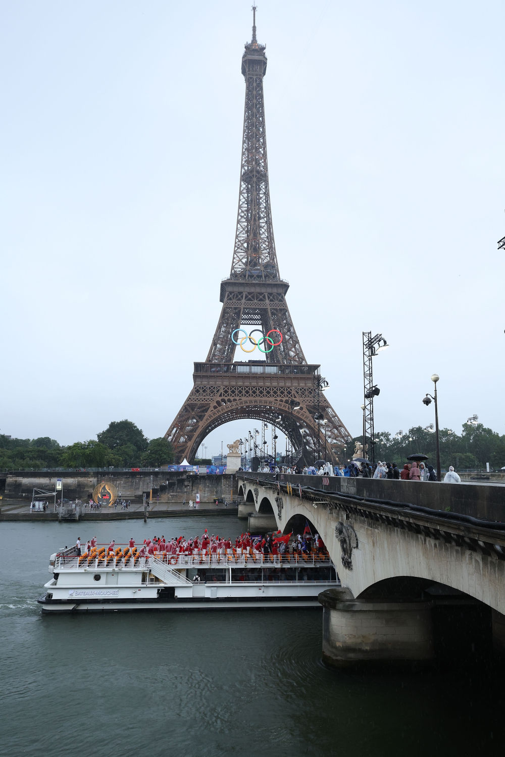 當(dāng)?shù)貢r間7月26日,第33屆夏季奧林匹克運動會開幕式在法國巴黎舉行。乒乓球運動員馬龍、花樣游泳運動員馮雨高擎五星紅旗,中國體育代表團運動員乘船在塞納河巡游。