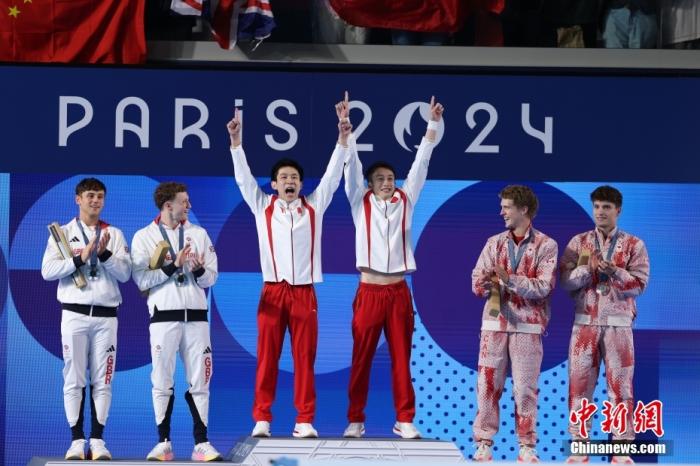 當?shù)貢r間7月29日,在巴黎奧運會跳水男子雙人十米臺決賽中,中國選手練俊杰/楊昊奪得金牌。圖為頒獎儀式。中新社記者 富田 攝
