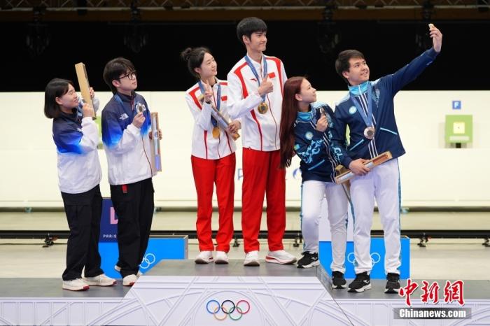 當?shù)貢r間7月27日,在法國沙托魯舉行的巴黎奧運會射擊10米氣步槍混合團體決賽中,中國組合黃雨婷/盛李豪奪得金牌。這也是本屆巴黎奧運會誕生的首枚金牌。圖為獲獎選手在頒獎儀式上自拍。中新社記者 趙文宇 攝