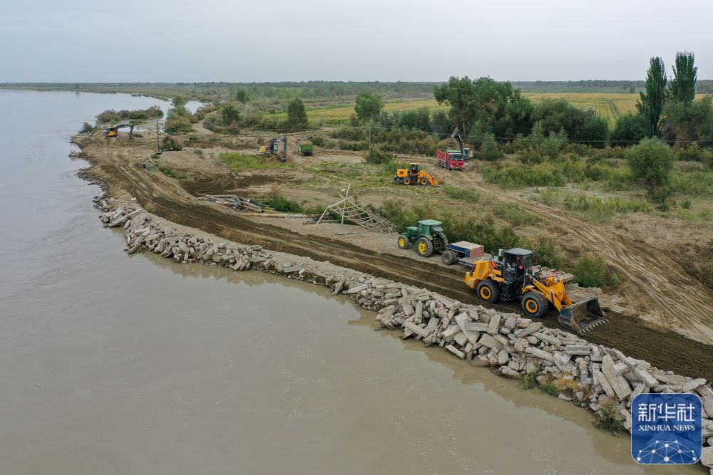 ↑在新疆阿克蘇地區(qū)沙雅縣蓋孜庫(kù)木鄉(xiāng)吐央村,搶險(xiǎn)人員駕駛大型機(jī)械進(jìn)行堤壩加固(8月3日攝)。