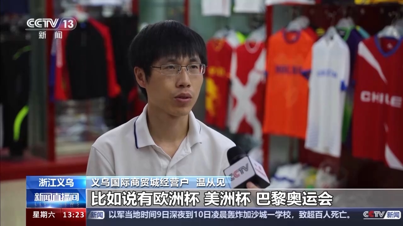 義烏國際商貿(mào)城經(jīng)營戶 溫從見:今年因?yàn)槭鞘澜绱筚惸?,比如說有歐洲杯、美洲杯、巴黎奧運(yùn)會(huì),差不多3月份開始,我們就已經(jīng)著手開始接單、打樣、生產(chǎn)這一系列的運(yùn)動(dòng)服飾。我們總共3個(gè)賽事下來銷了30萬件左右。
