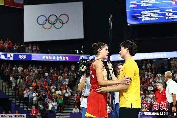 面對(duì)痛苦跪地、嚎啕大哭的馬林,何冰嬌主動(dòng)走上前,用一個(gè)溫暖的擁抱給予對(duì)手安慰與尊重,展現(xiàn)出中國運(yùn)動(dòng)員的風(fēng)度和胸襟。
