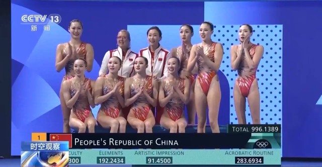 996.1389分!中國花游姑娘們以三場比賽穩(wěn)居第一的優(yōu)異表現(xiàn),贏得了中國花游在奧運(yùn)會(huì)上奪得的首枚金牌。