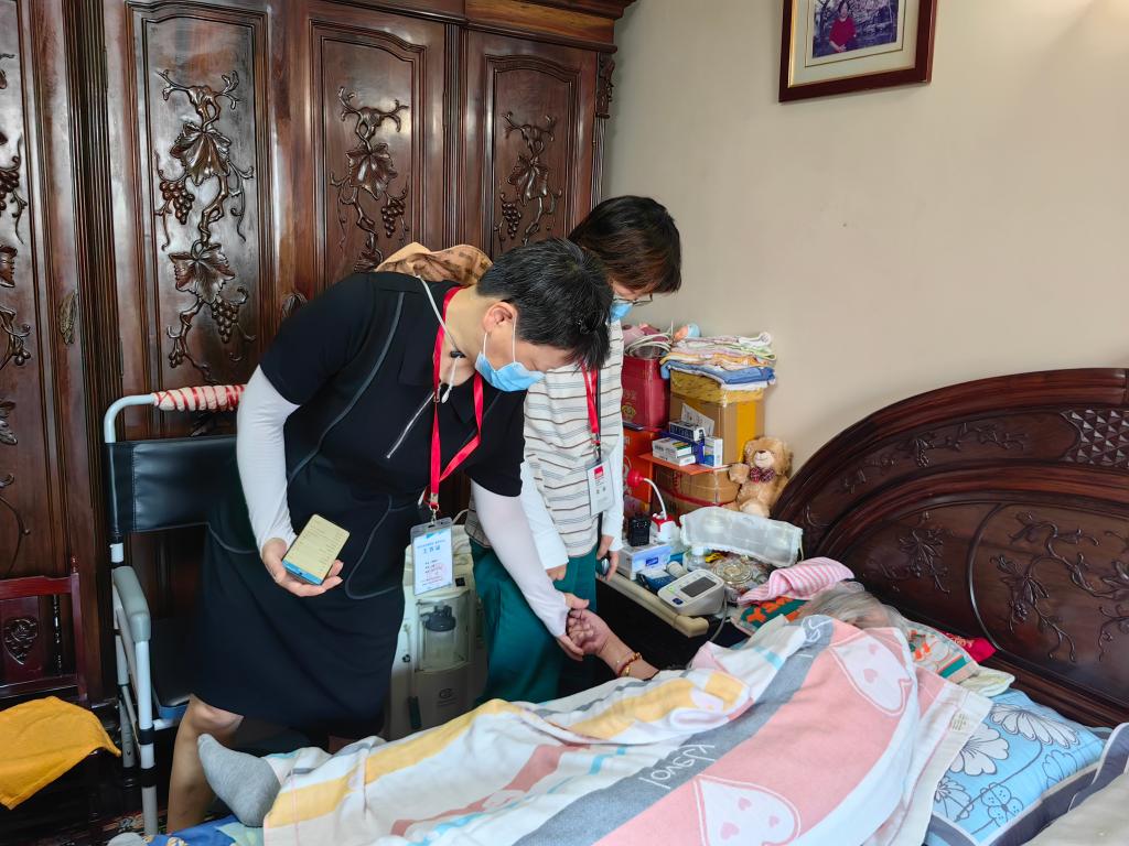 上海市普陀區(qū)老年照護(hù)統(tǒng)一需求評(píng)估員李穎芳(圖左)與社區(qū)醫(yī)生一同為老人做照護(hù)需求評(píng)估。新華社記者吳振東 攝