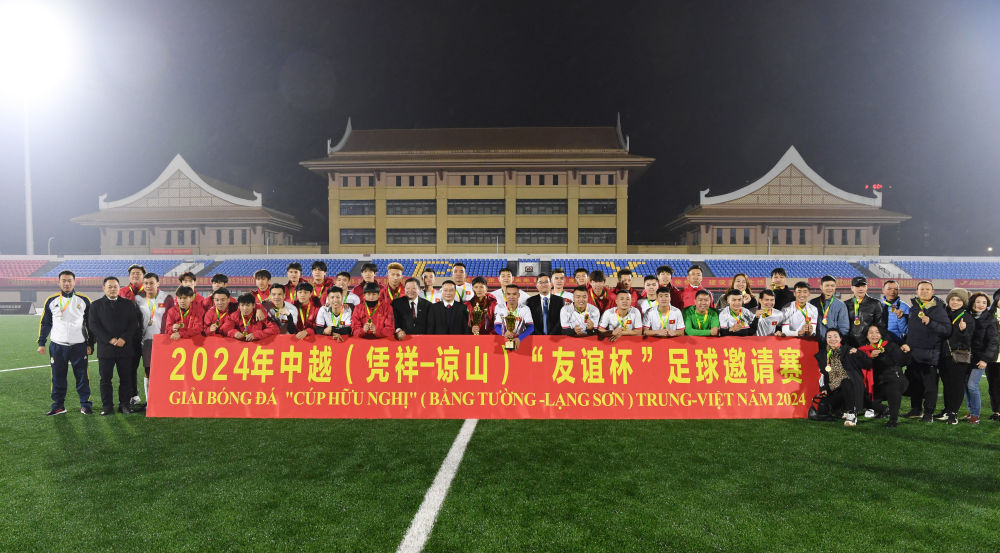 2024年中越(憑祥-諒山)“友誼杯”足球邀請(qǐng)賽,賽后雙方隊(duì)員合影。(龐立堅(jiān) 攝)