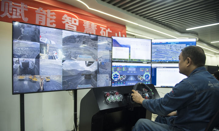 2024年4月11日,技術(shù)人員在位于四川省攀枝花市的攀鋼礦業(yè)朱蘭鐵礦智慧管控中心遠(yuǎn)程操控?zé)o人自動(dòng)駕駛礦車(chē)。新華社記者 張豪夫 攝