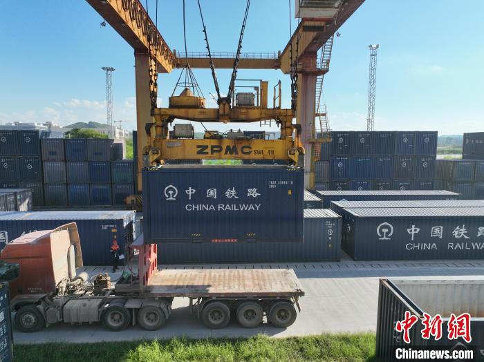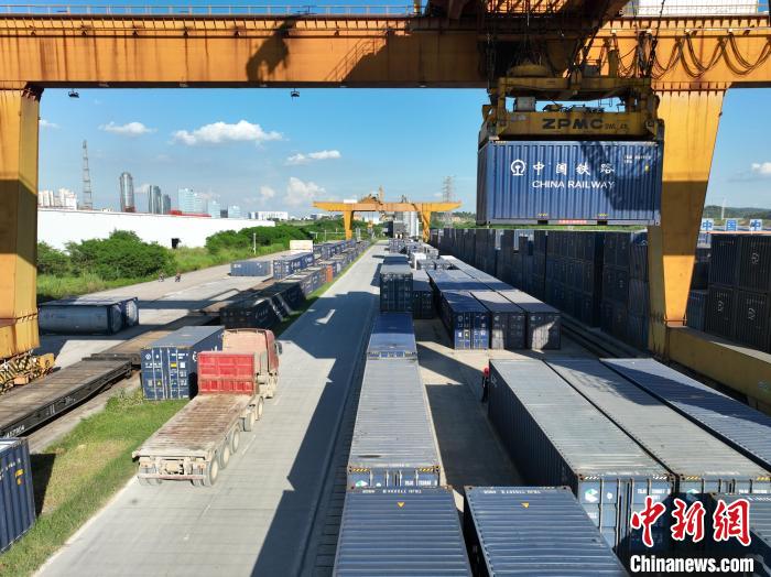 8月26日,廣西南寧國際鐵路港內(nèi),鐵路職工頂著下午的烈日,正在為發(fā)往越南的貨運(yùn)班列裝卸貨物。該鐵路港是廣西始發(fā)中越班列的核心場站。國鐵南寧局提供的信息顯示,今年前7個月,廣西始發(fā)中越班列累計(jì)發(fā)運(yùn)貨物6850標(biāo)箱,同比增長16倍;其中7月份發(fā)運(yùn)1922標(biāo)箱,超過今年一季度發(fā)運(yùn)量總和,為今年以來第三次刷新單月發(fā)運(yùn)量紀(jì)錄。圖為集裝箱擺滿場站,等待裝車。王以照 攝