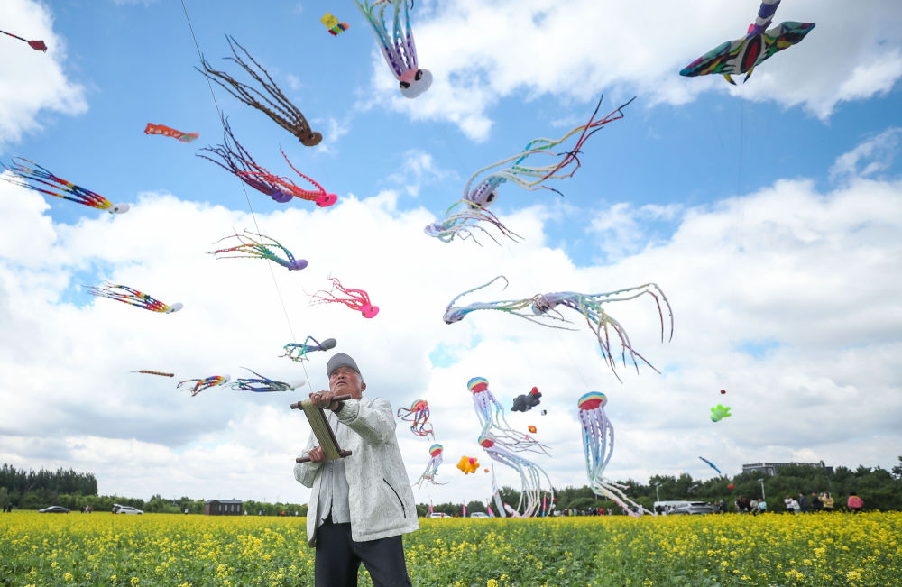 在遼寧省康平縣,一名風(fēng)箏愛好者在風(fēng)箏節(jié)活動現(xiàn)場放風(fēng)箏(5月31日攝)。