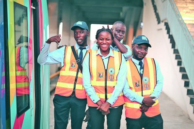 6月12日,在尼日利亞拉各斯,拉各斯輕軌藍(lán)線項(xiàng)目動(dòng)車組列車司機(jī)組長伊莎貝拉·亞當(dāng)斯·伊斯拉埃爾(中)與同事在站臺上合影。新華社發(fā)