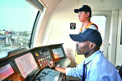 尼日利亞拉各斯,中國(guó)師傅指導(dǎo)當(dāng)?shù)匾?jiàn)習(xí)司機(jī)駕駛中企承建的輕軌列車(chē)。新華社發(fā)