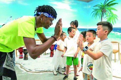 在位于湖南高橋大市場(chǎng)的中非經(jīng)貿(mào)博覽會(huì)常設(shè)展館安哥拉館,志愿者和學(xué)生在研學(xué)過(guò)程中擊掌。新華社發(fā)
