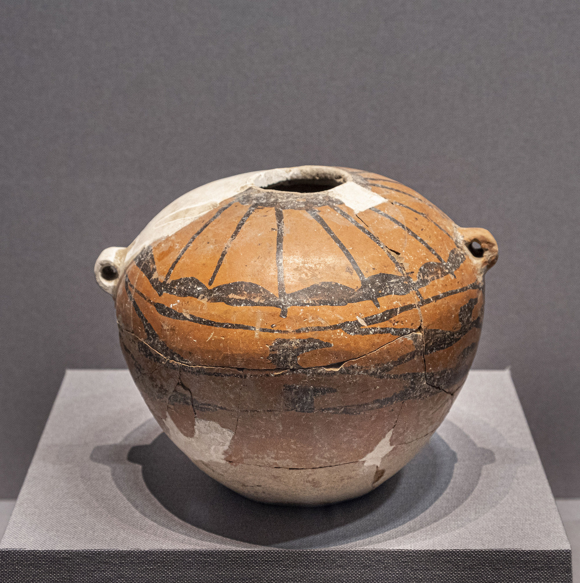 這件彩陶雙耳罐,有寬大的肩膀,圓圓的嘴巴,鼓鼓的肚子,小小的耳朵,像不像一位慈祥的老者,訴說著五六千年前的往事呢?