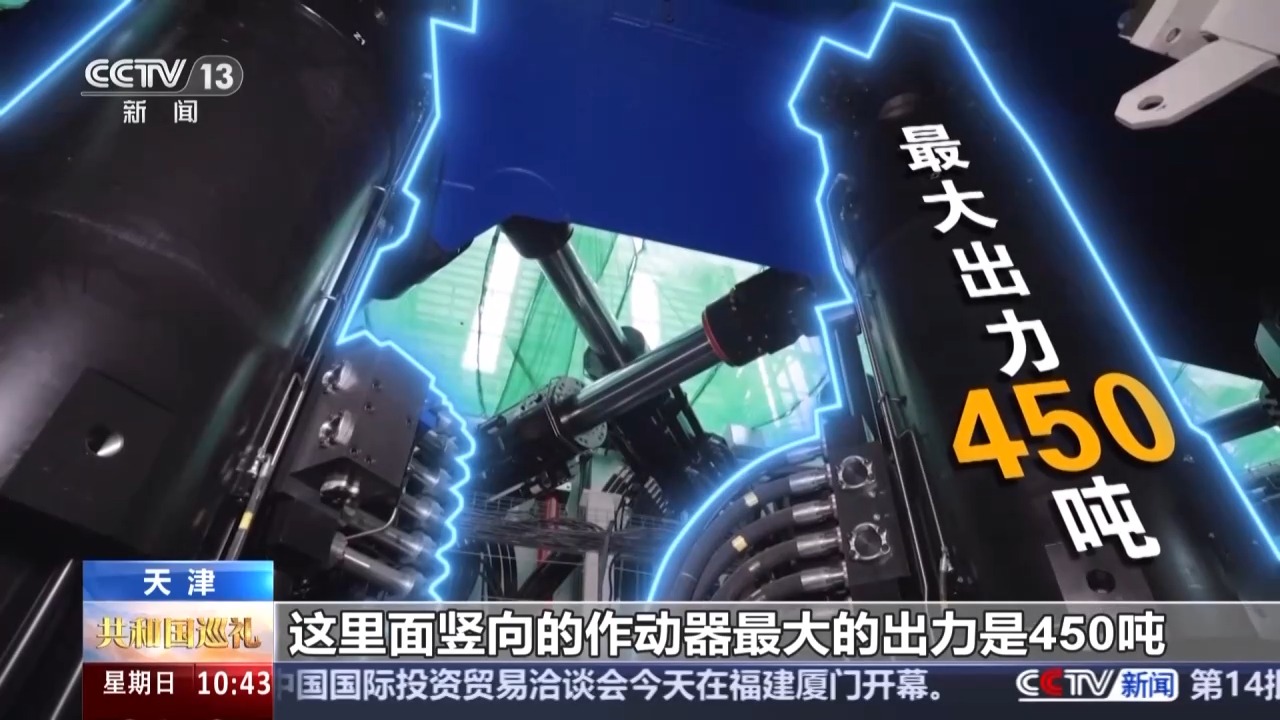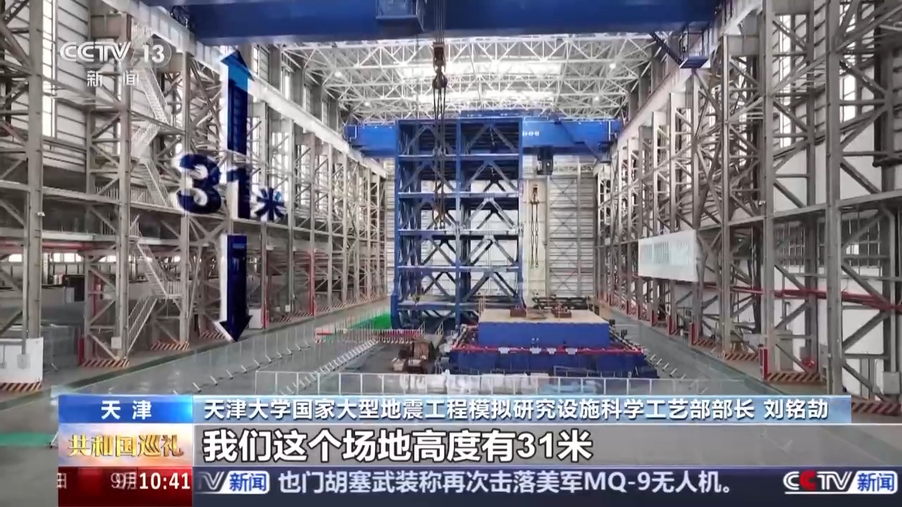 天津大學(xué)國家大型地震工程模擬研究設(shè)施科學(xué)工藝部部長 劉銘劼:我們這個場地高度有31米,跨度有43米,這部分區(qū)域的長度是120米。我們這個振動臺臺面尺寸20米乘16米,最大載重1350噸,大概是二十多輛重載卡車的重量。我們在滿載情況下可以運行的最大加速度是2.0個重力加速度。這么大的加速度實際上已經(jīng)超過了我們9度烈度條件下的地震動的水平。