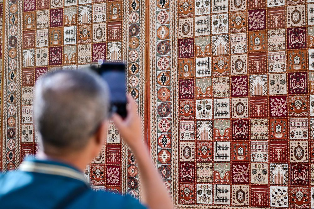 步入龜茲小巷,一幅巨大的地毯墻首先映入眼簾,地毯上大大小小的方格整齊排列,圖案精美對(duì)稱、色彩艷麗。地毯是新疆少數(shù)民族家庭中最常見(jiàn)的裝飾品,一般以羊毛剪裁編織而成,集繪畫、雕刻、編織、刺繡、印染等手工技藝于一體,是展現(xiàn)新疆民族風(fēng)情的典型物品之一。