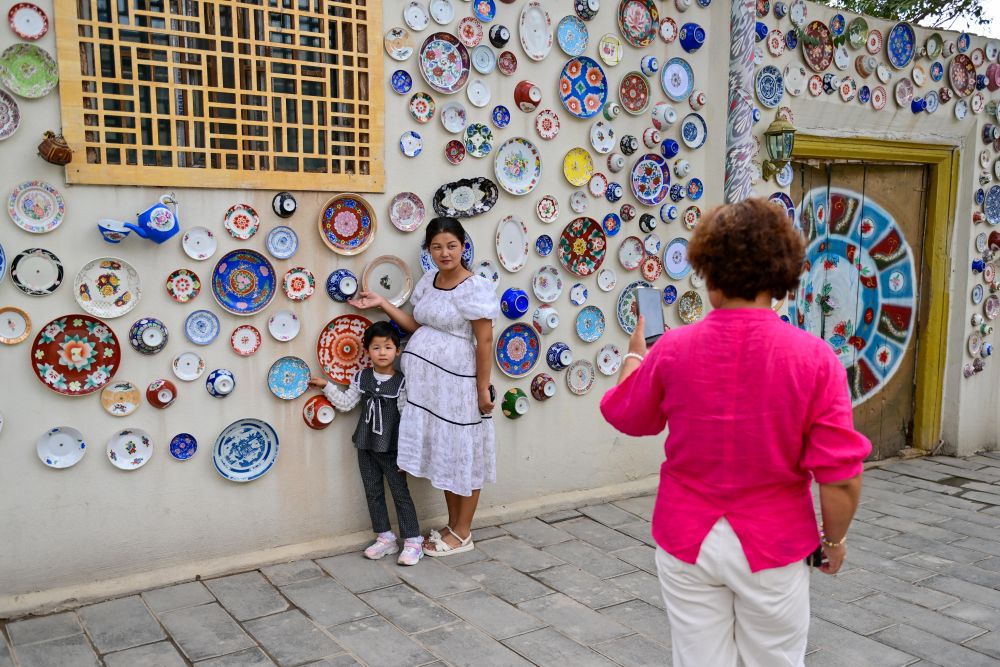 游客在新疆庫(kù)車市龜茲小巷拍照留念。新華社記者 丁磊 攝