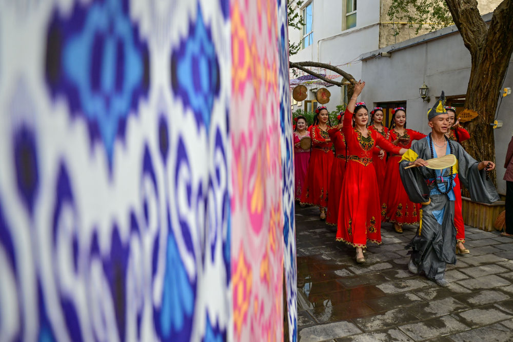 在新疆庫(kù)車市龜茲小巷,樂(lè)舞表演團(tuán)隊(duì)在小巷巡演。新華社記者 丁磊 攝