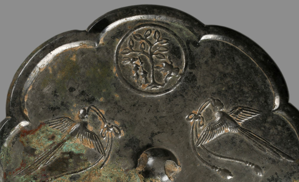 畫面中部鏡鈕兩側(cè),是兩只口銜綬帶的鳥兒。它們拖著長(zhǎng)長(zhǎng)的尾羽,雙翅伸展相對(duì)飛舞,口中的綬帶飄逸飛揚(yáng)。在它們的目光交匯處,是這組畫面的主題:月宮。