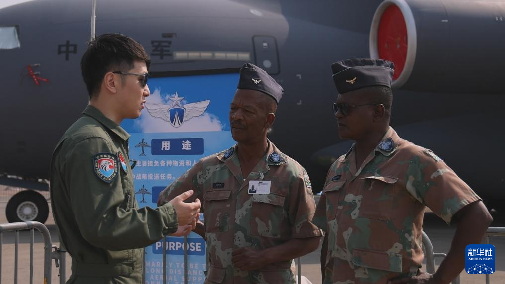 9月18日,中國空軍運-20機組成員在南非首都比勒陀利亞的非洲航空航天與防務(wù)展上向外國友人進行介紹。新華社發(fā)(王銳杰攝)