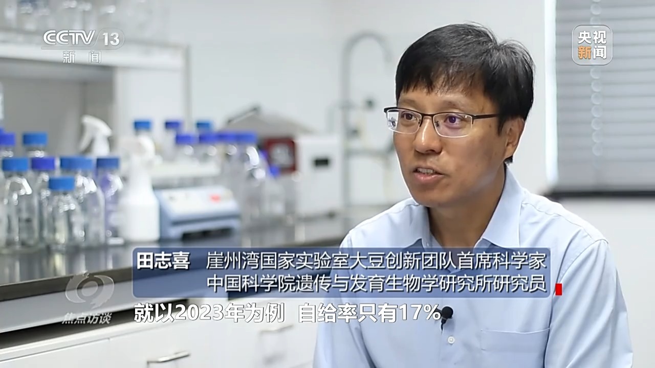崖州灣國(guó)家實(shí)驗(yàn)室大豆創(chuàng)新團(tuán)隊(duì)首席科學(xué)家、中國(guó)科學(xué)院遺傳與發(fā)育生物學(xué)研究所研究員 田志喜:中國(guó)大豆的自給率太低了,以2023年為例,只有17%,在這種情況下,保證我們糧食安全,大豆義不容辭、責(zé)無旁貸,提高它的自給率。