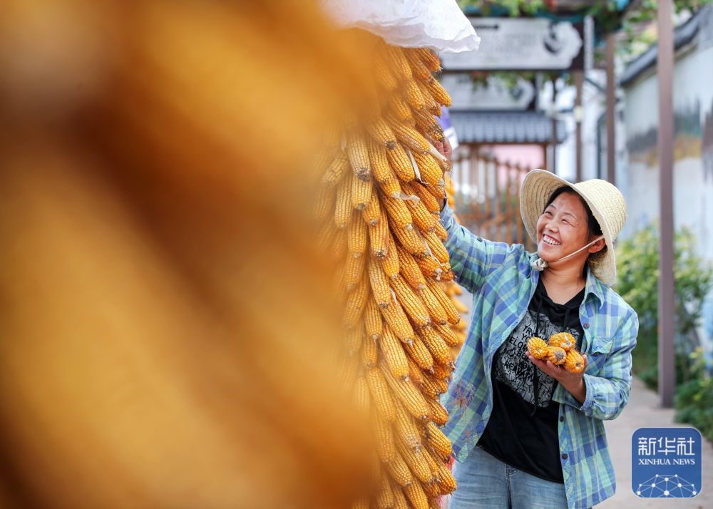 9月22日,在四川省達(dá)州市大竹縣朝陽鄉(xiāng)木魚村,駐村工作隊員和村民在晾曬收獲的玉米。