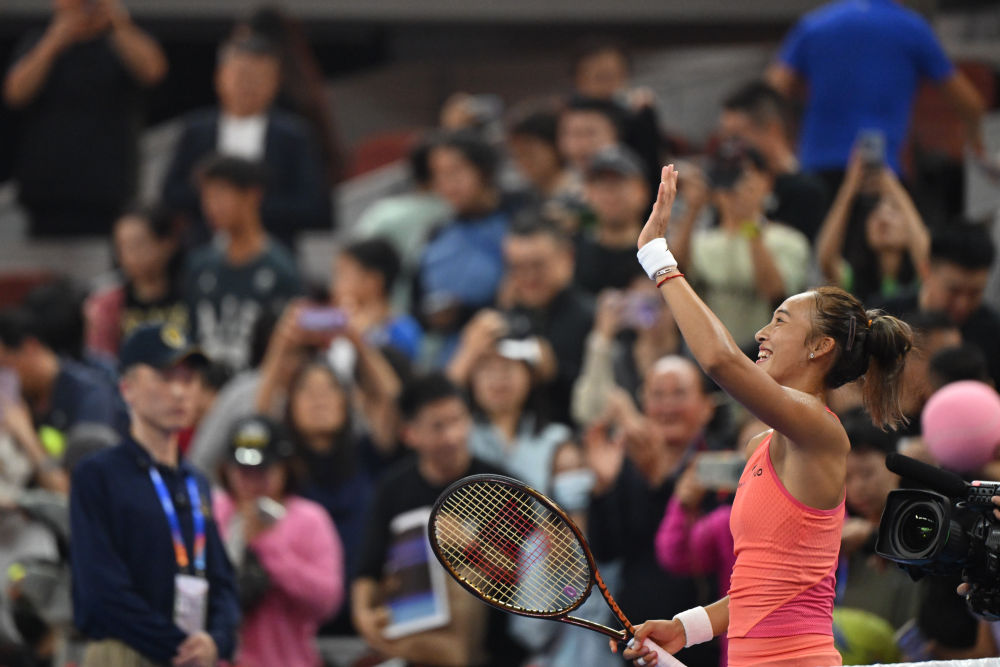 9月28日,鄭欽文在賽后向觀眾致意。當日,在北京進行的2024中國網(wǎng)球公開賽女單第二輪比賽中,中國選手鄭欽文2:0戰(zhàn)勝俄羅斯選手拉希莫娃,晉級下一輪。新華社記者 張龍 攝