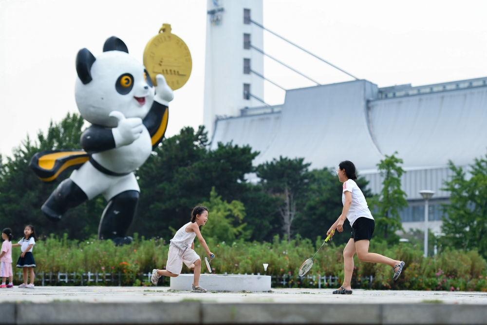 2023年8月20日,市民在位于北京的國家奧林匹克體育中心小廣場上打羽毛球。國家奧林匹克體育中心是我國第一個承辦大型綜合性國際體育賽事的體育場館群,為1990年北京亞運會而建。新華社記者 陳鐘昊 攝