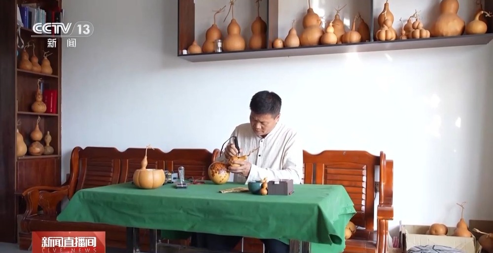 在伊車嘎善錫伯族鄉(xiāng)加爾蘇村,48歲的曹光耀潛心創(chuàng)作葫蘆烙畫已經(jīng)有10年,自幼喜歡畫畫的他,將電烙鐵變成靈活的畫筆,在葫蘆上勾勒出一幅幅動(dòng)人的新疆百景圖。