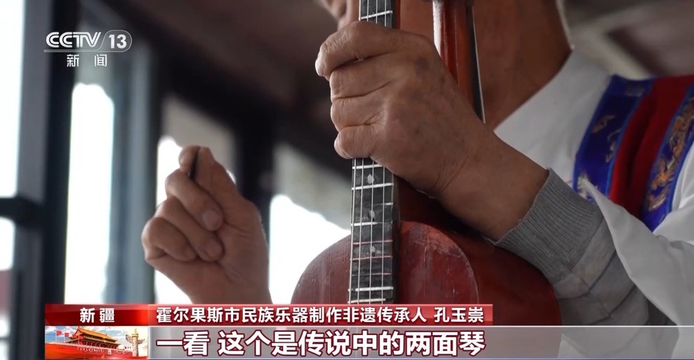 霍爾果斯市民族樂(lè)器制作非遺傳承人 孔玉崇:老人畫了一個(gè)圖,他問(wèn)我,這樣的一個(gè)琴你能不能做。我一看,這個(gè)是傳說(shuō)中的兩面琴,我說(shuō)我做,就這樣開始了。