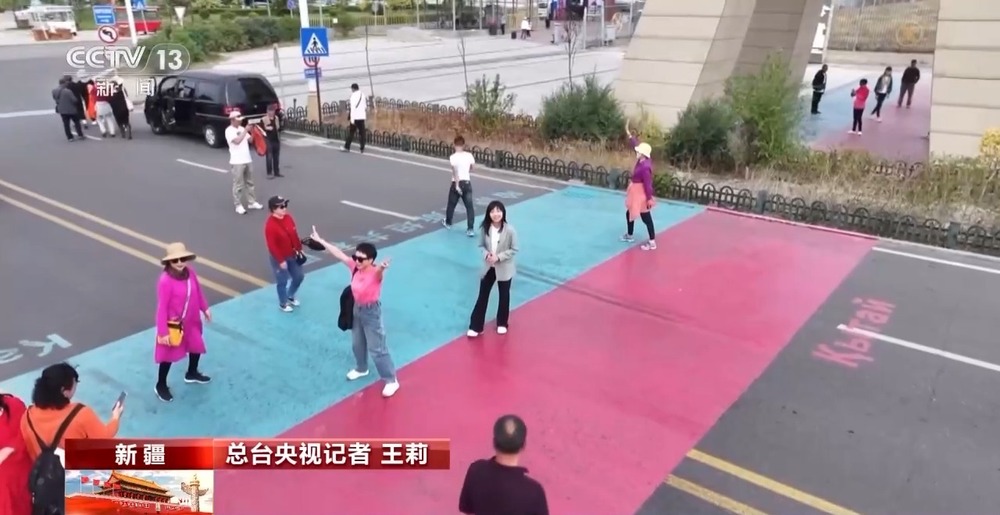 總臺(tái)央視記者 王莉:進(jìn)入合作中心,中哈連接通道處的“一步跨兩國(guó)”,絕對(duì)是游客的打卡首選地。紅色和藍(lán)色交界的地方,就是國(guó)界線了,線的一側(cè)紅色區(qū)域代表中國(guó),藍(lán)色區(qū)域代表哈薩克斯坦。前一秒還在中國(guó),只要一腳邁過(guò)分界線,就能一秒“出國(guó)”,來(lái)到哈薩克斯坦。