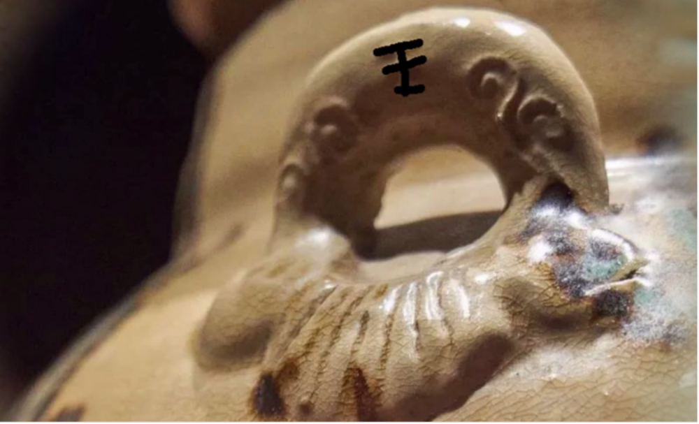 青釉褐綠點彩云紋雙耳罐的罐身印有“王”的字樣。圖片來源:揚州日報社