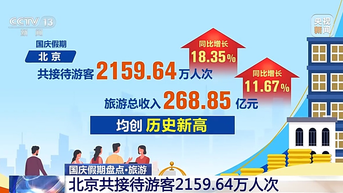 統(tǒng)計(jì)數(shù)據(jù)顯示,國(guó)慶假期,北京共接待游客2159.64萬(wàn)人次,同比增長(zhǎng)18.35%;旅游總收入268.85億元,同比增長(zhǎng)11.67%,均創(chuàng)歷史新高。文博游、北京中軸線(xiàn)游、京郊游、微度假游、體育賽事游、特色商圈文化街區(qū)游、花燈游、網(wǎng)紅潮玩打卡地游等受到游客青睞。