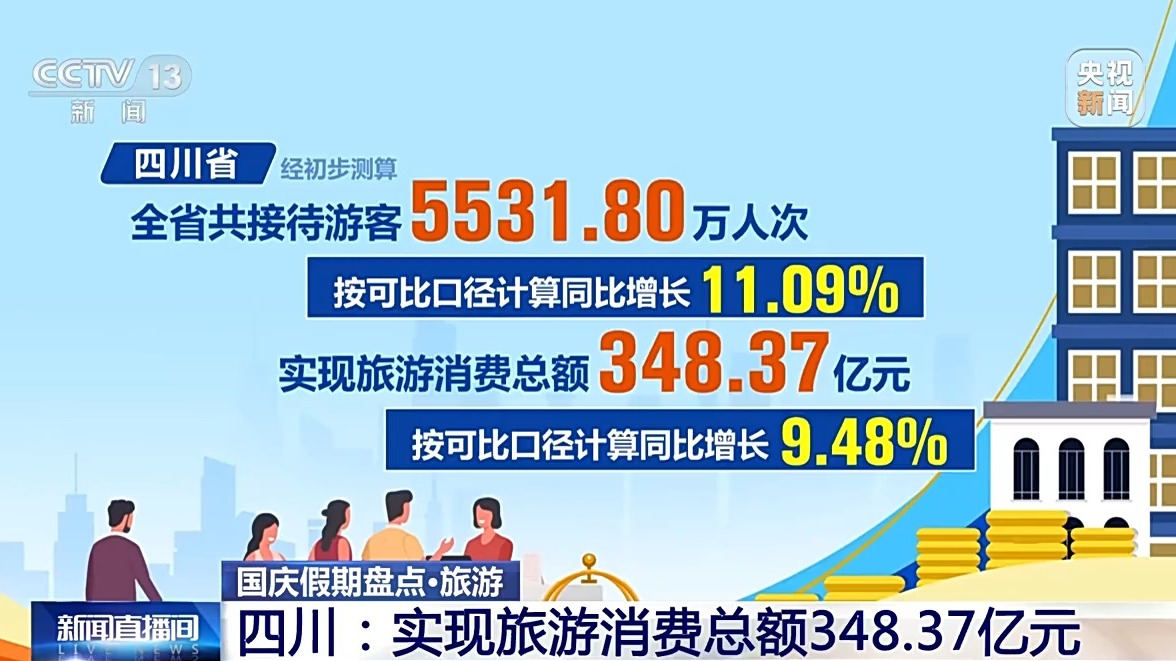四川省經(jīng)初步測(cè)算,全省共接待游客5531.80萬(wàn)人次,實(shí)現(xiàn)旅游消費(fèi)總額348.37億元,按可比口徑計(jì)算,同比分別增長(zhǎng)11.09%和9.48%。全省核心旅游景區(qū)“狀態(tài)拉滿(mǎn)”,17家5A級(jí)景區(qū)累計(jì)接待游客426.93萬(wàn)人次、實(shí)現(xiàn)門(mén)票收入1.85億元,同比分別增長(zhǎng)25.06%和15.48%,超越假日歷史最高水平。九寨溝景區(qū)連續(xù)4天均達(dá)4.1萬(wàn)人承載量上限。