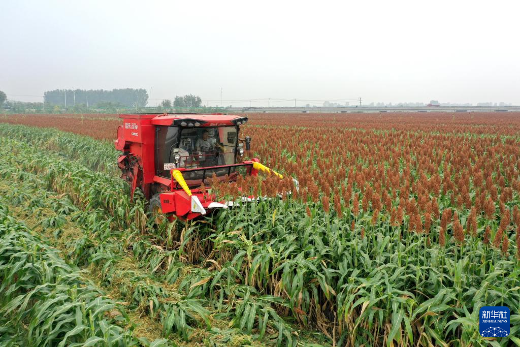 10月7日,在河北省邢臺市南和區(qū)和陽鎮(zhèn)東關(guān)村,農(nóng)民駕駛收割機(jī)收獲高粱(無人機(jī)照片)。新華社記者 王曉 攝