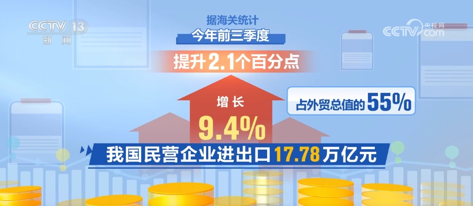 據(jù)海關(guān)統(tǒng)計(jì),今年前三季度,我國(guó)民營(yíng)企業(yè)進(jìn)出口17.78萬億元,增長(zhǎng)9.4%,占外貿(mào)總值的55%,提升2.1個(gè)百分點(diǎn);外商投資企業(yè)進(jìn)出口9.53萬億元,增長(zhǎng)1.1%,連續(xù)兩個(gè)季度增長(zhǎng);國(guó)有企業(yè)進(jìn)出口4.95萬億元,增長(zhǎng)0.1%。