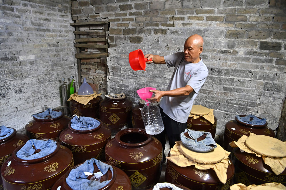 一位村民在廣西來(lái)賓市象州羅秀鎮(zhèn)納祿村用水瓢裝自釀米酒(10月9日攝)。