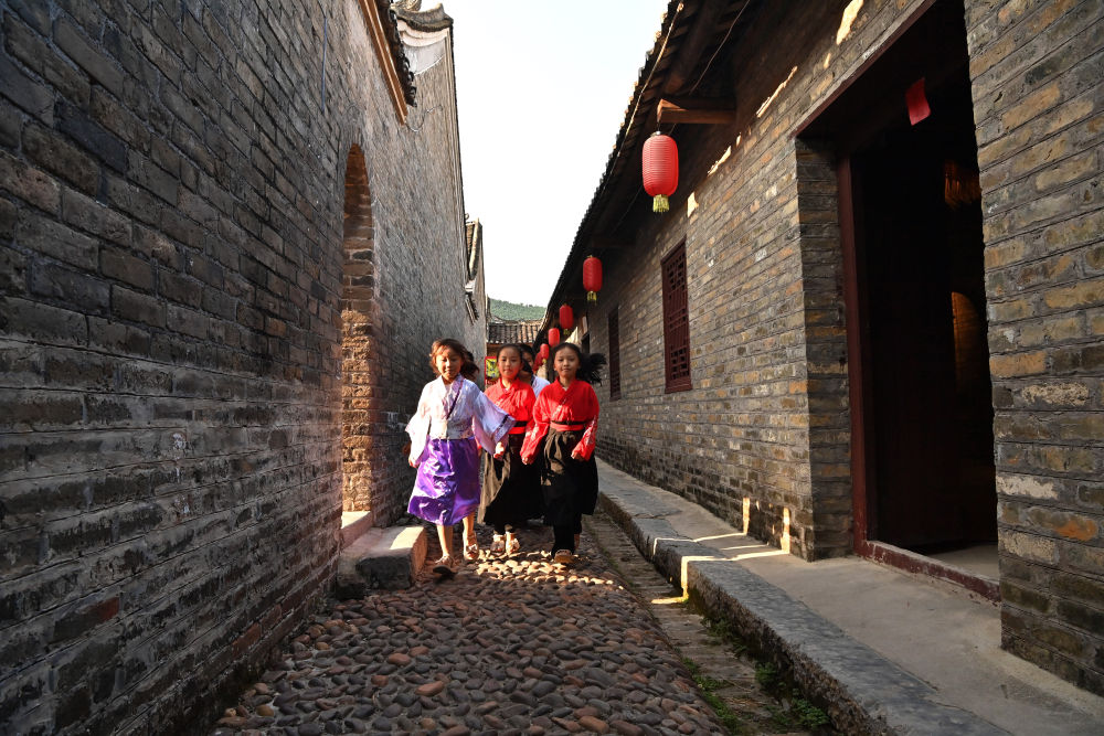 幾名孩子在廣西來(lái)賓市象州羅秀鎮(zhèn)納祿村的古巷里奔跑(10月10日攝)。
