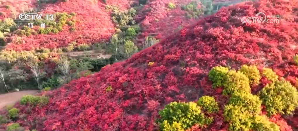 金秋時(shí)節(jié),在河南許昌禹州市鳩山鎮(zhèn),漫山遍野的紅葉在秋風(fēng)中翩躚起舞。從空中俯瞰,滿(mǎn)山鮮艷的紅葉、黃葉和翠綠色的松柏相互交織映襯,色彩斑斕、姹紫嫣紅,令人心曠神怡。在璀璨的秋日陽(yáng)光照耀下,片片紅葉或鮮紅似火,或閃爍生輝,紅得各有千秋,把群山裝扮得分外妖嬈。
