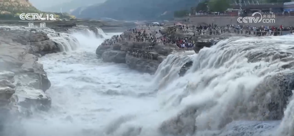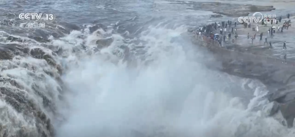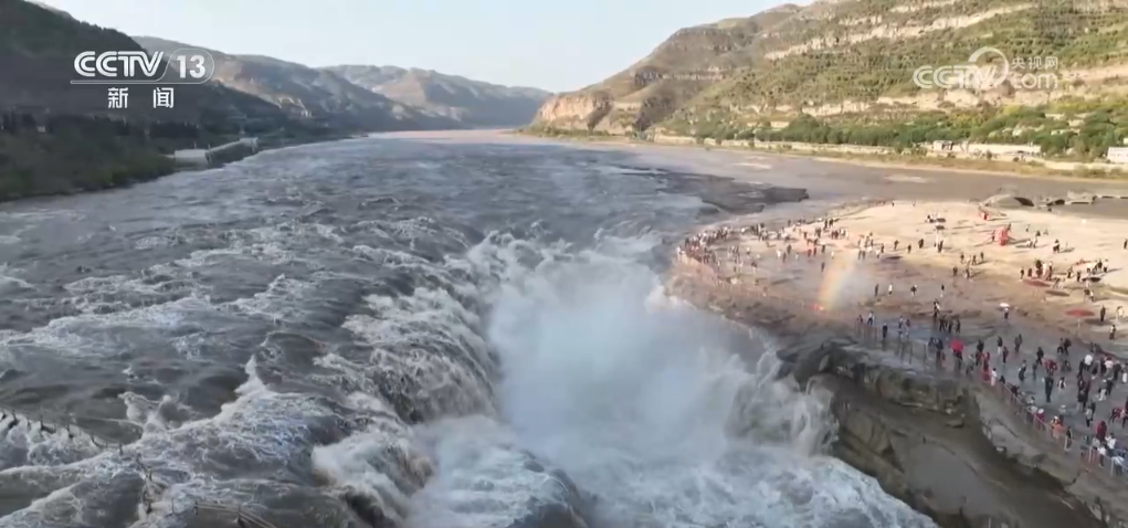 連日來(lái),受上游水庫(kù)調(diào)節(jié)放水影響,位于山西吉縣和陜西宜川縣交界的黃河壺口瀑布水量豐沛。從空中俯瞰,黃河流經(jīng)晉陜峽谷到達(dá)壺口,水面由三四百米寬驟然收縮為50多米,再墜入“十里龍槽”,濺起數(shù)十米高的水霧,氣勢(shì)磅礴。據(jù)了解,黃河壺口段目前正處于秋汛期,最大水流量約為1300立方米/秒,是日常水流量的3倍,主瀑與副瀑連成一片,呈現(xiàn)出一條線(xiàn)狀,場(chǎng)面壯觀。進(jìn)入10月份以來(lái),黃河壺口瀑布景區(qū)日均接待游客超過(guò)2萬(wàn)人次。