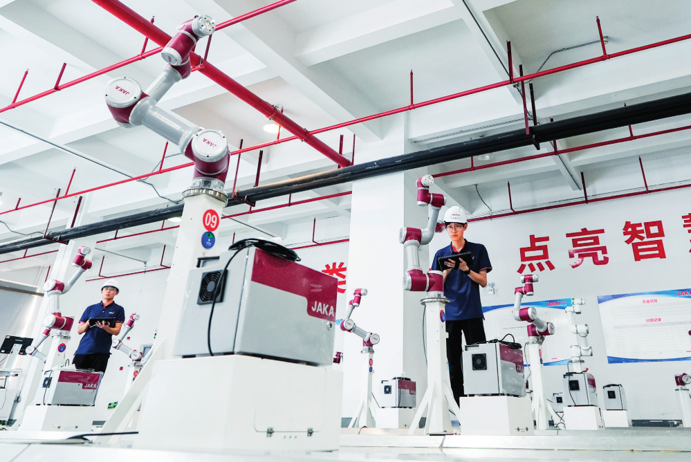 在位于江蘇省常州市武進(jìn)區(qū)的常州節(jié)卡智能裝備有限公司制造基地,工作人員在對柔性智能協(xié)作機(jī)器人進(jìn)行全系列測試(2024 年 6 月 14 日攝) 李博攝 / 本刊