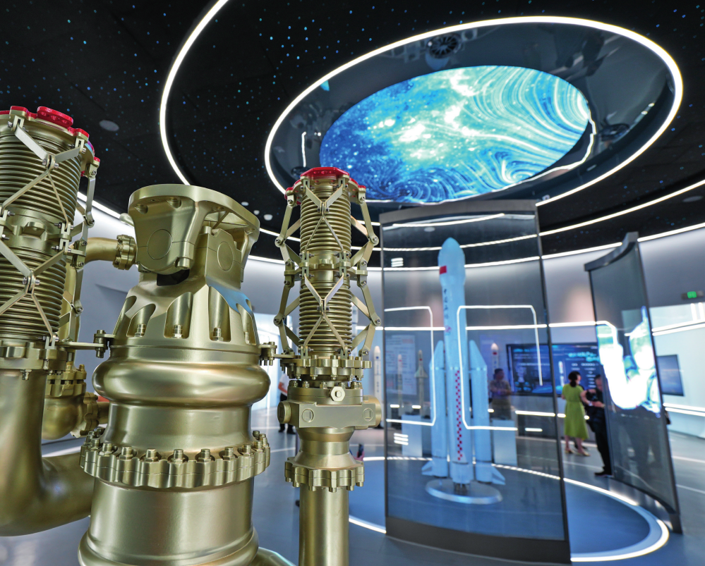 在無錫商業(yè)航天展示館拍攝的火箭發(fā)動機(jī)模型(2024 年 9 月 9 日攝) 楊磊攝 / 本刊