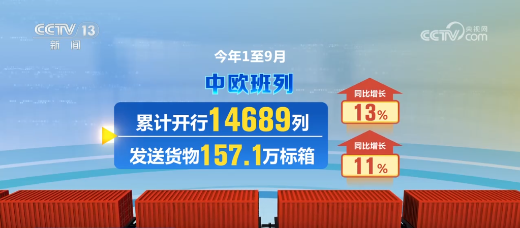 數(shù)據(jù)顯示,今年1至9月,中歐班列累計(jì)開行14689列,發(fā)送貨物157.1萬標(biāo)箱,同比分別增長(zhǎng)13%、11%。其中9月份開行1633列,發(fā)送貨物17.1萬標(biāo)箱,同比分別增長(zhǎng)15%、12%。