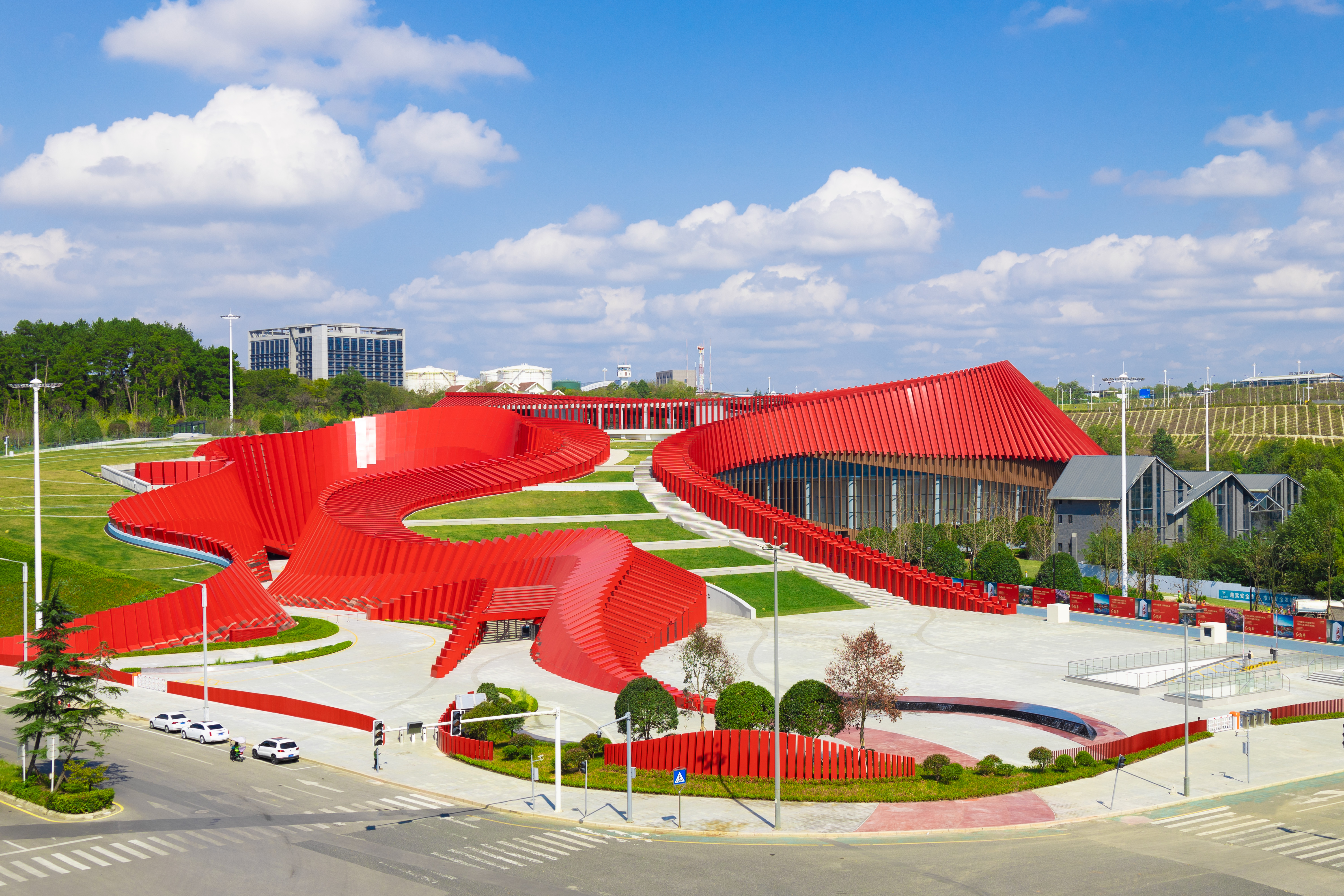乘坐航班前往貴陽的游客,若在貴陽龍洞堡機(jī)場上空俯瞰,可發(fā)現(xiàn)有一座巨型建筑鋪展在青山綠水之間。它由一塊塊紅色的曲面幕墻構(gòu)成,此起彼伏,形成了連續(xù)轉(zhuǎn)折的動態(tài)輪廓,猶如一條靈動的“紅飄帶”。它就是全國首個(gè)以長征為主題的全域沉浸式數(shù)字科技體驗(yàn)館,也是長征國家文化公園貴州重點(diǎn)建設(shè)區(qū)的標(biāo)志性、引領(lǐng)性工程。