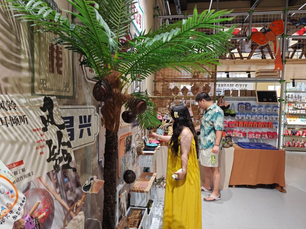 在老街一家非遺文創(chuàng)店里,來自浙江杭州的游客王銣斐正在挑選用椰子殼制作的冰箱貼,準(zhǔn)備作為禮物送給朋友。